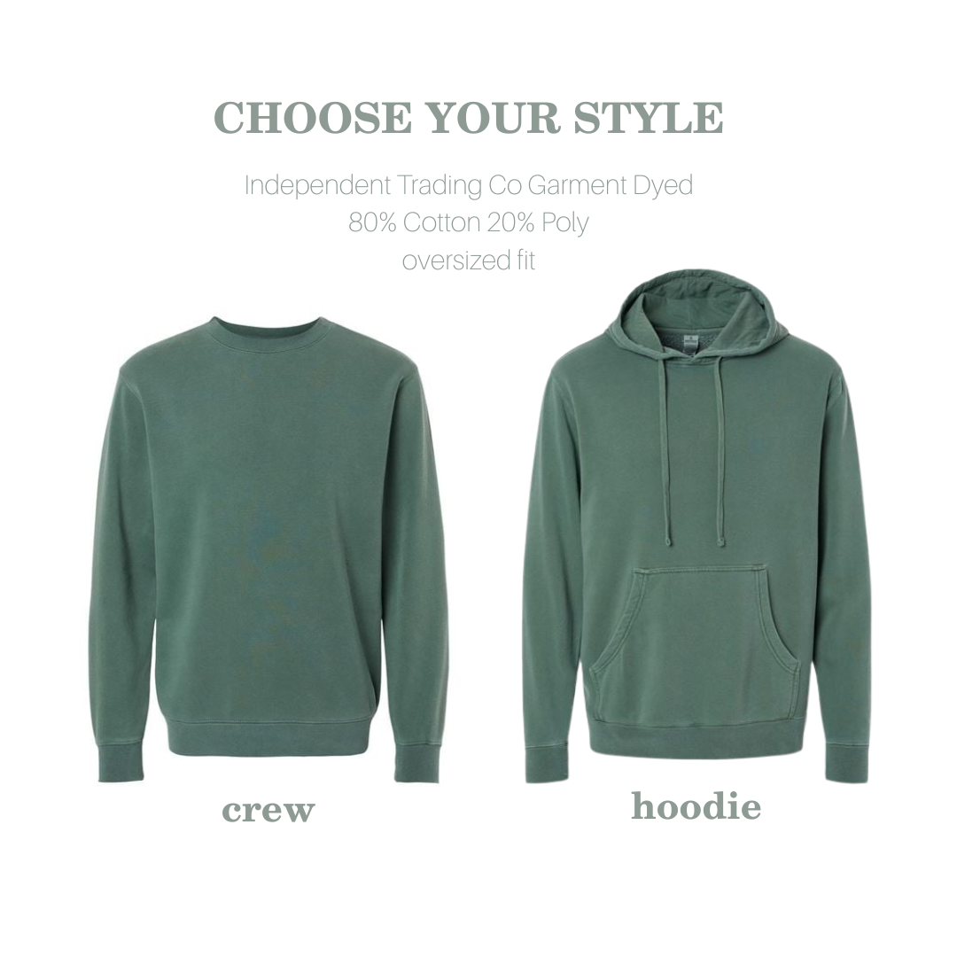 Embroidered on the coziest green Independent Trading Co. sweatshirts. choose from crew or hoodie.